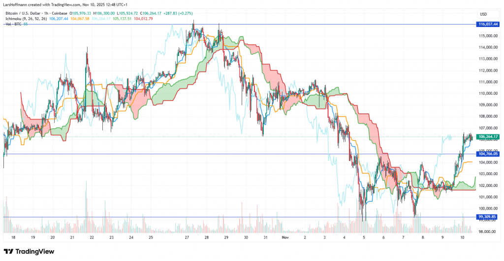 Beim Bitcoin bildete sich in der vergangenen Woche ein Doppelboden bei knapp 100.000 Dollar aus. Die Zuversicht über ein Ende des Shutdowns stärkt das Interesse der Anleger an Risikoanlagen und daher auch an Kryptowährungen.