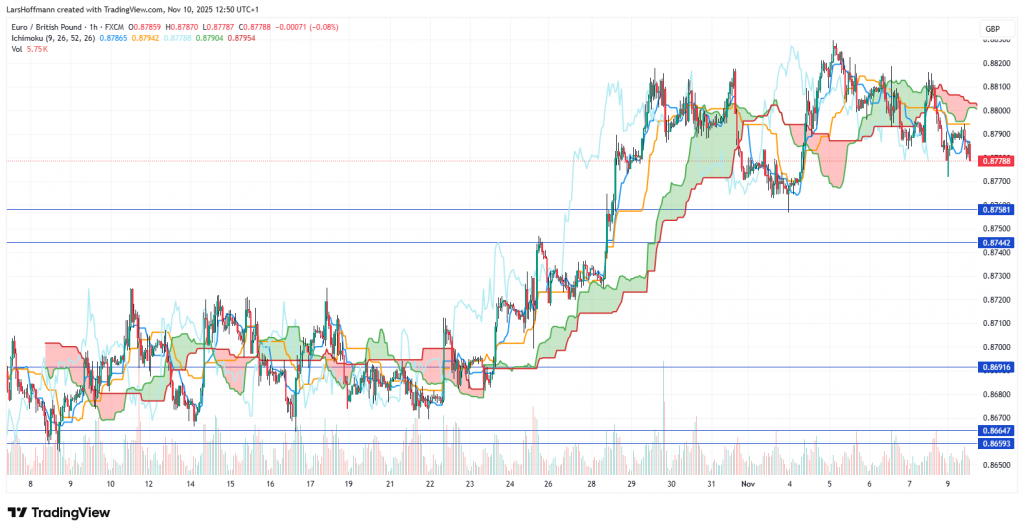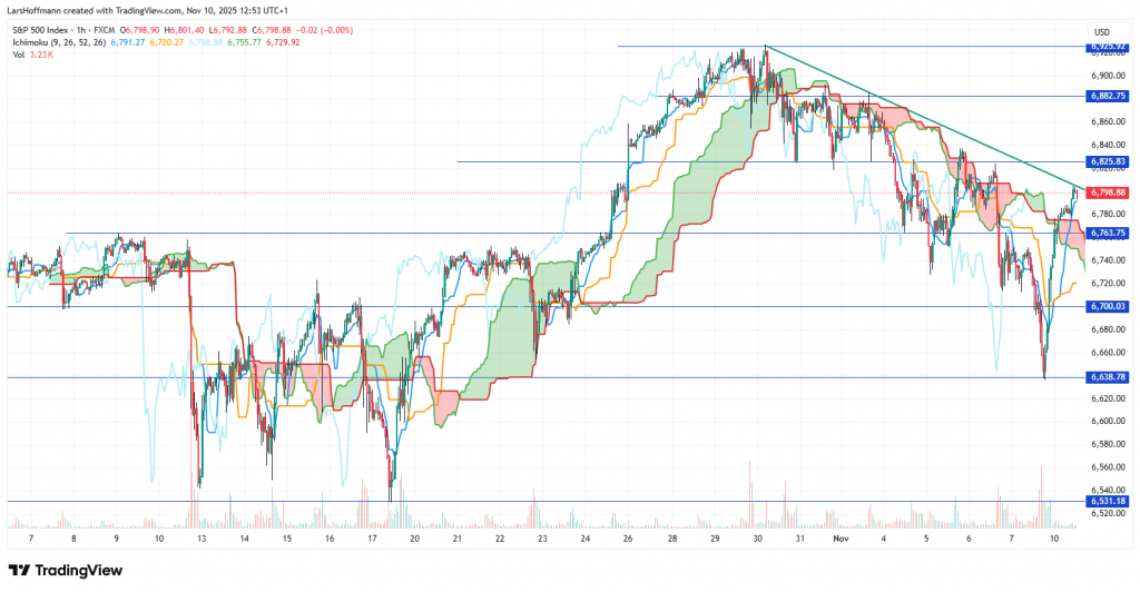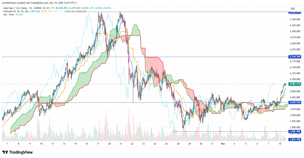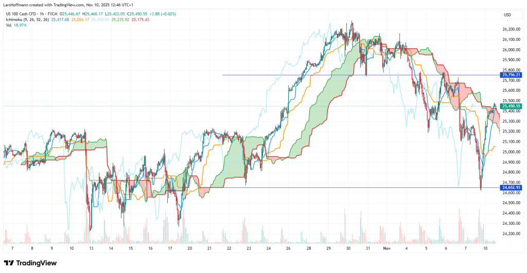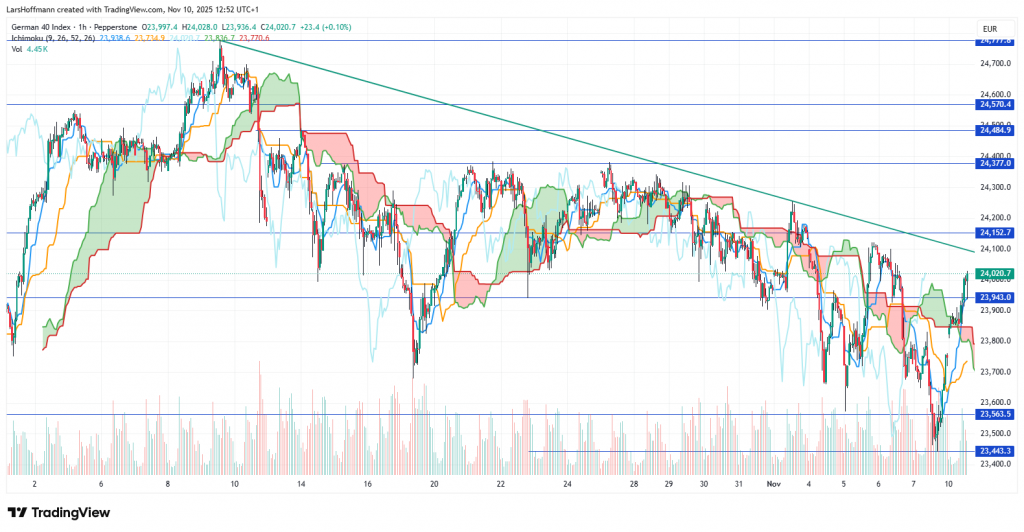 Der Dax profitiert am Montag ebenfalls von der Aussicht, dass der Regierungsstillstand in den USA enden könnte. Trotzdem bleibt der deutsche Leitindex vorerst in einem Abwärtstrend gefangen. Auf der Unterseite ist das Tief vom Freitag bei 23.440 Punkten der wichtigste Support. Ein Zeichen der Stabilisierung dürfte ein Sprung über die 24.150 signalisieren.