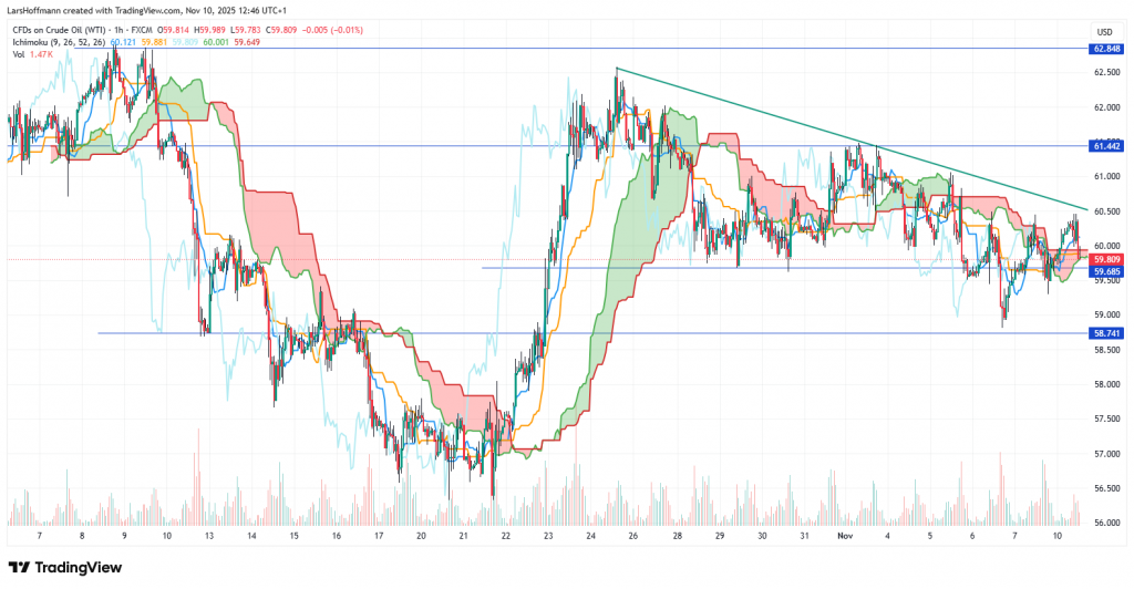 Übergeordnet bleibt die Skepsis über die Konjunktur bestehen. Die Konjunkturdaten der vergangenen Woche konnten erneut nicht überzeugen, was bei den Anlegern an den Börsen zu verhaltenen Reaktionen geführt hatte. Sichtbar wird die Sorge um die Konjunktur am Ölpreis. Die Stabilisierung um die 60-Dollar-Marke ist noch nicht nachhaltig, wie ein Blick auf den Chart zeigt. Das schwarze Gold befindet sich weiterhin in einem kurzfristigen Abwärtstrend.