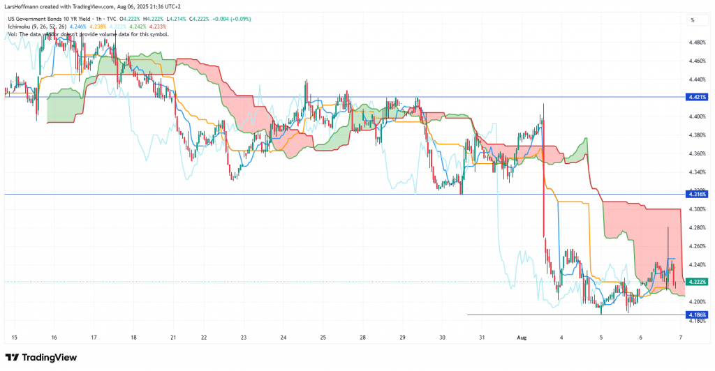 Die Marktteilnehmer blicken lieber hoffnungsfroh auf die Fed und scheinen sich sehr sicher zu sein, dass die US-Notenbank im September die Zinsen senkt. Anzeichen dafür gibt es tatsächlich. Die Konjunktur und besonders der Arbeitsmarkt präsentieren Bremsspuren. Sie sind inzwischen so breit, dass Donald Trump die Überbringerin der schlechten Nachrichten kurzerhand feuert. Im Märchen gehen solche Geschichten meistens nicht gut aus. Die schlechten Nachrichten verschwinden nicht, wenn man die Verkünder in die Wüste schickt.