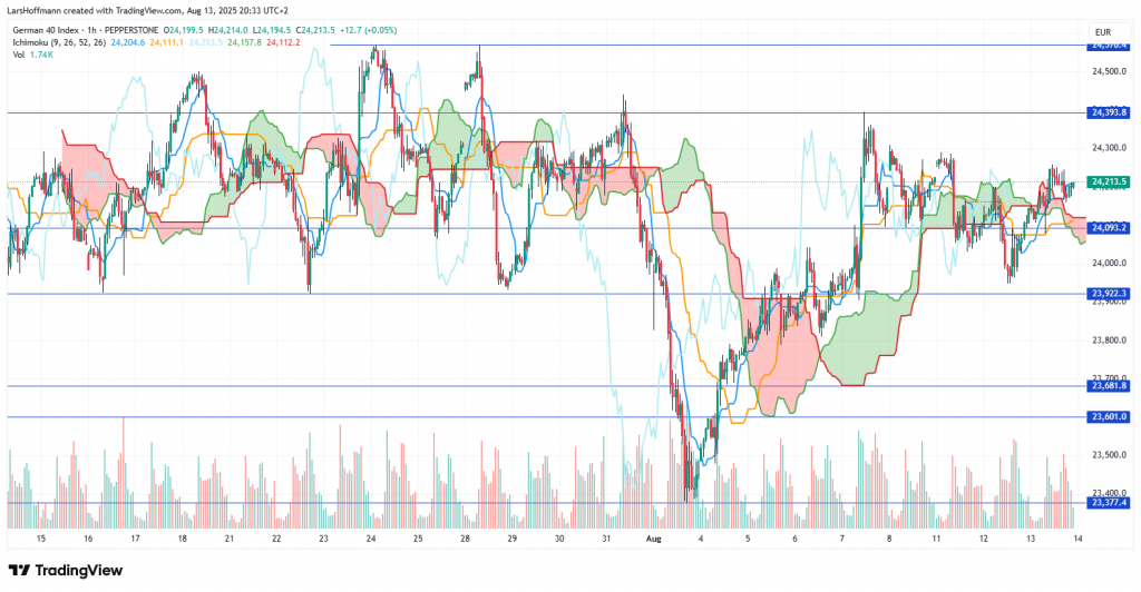 Der DAX fiel gestern kurz unter die 24.000-Punkte-Marke, drehte jedoch nach der Veröffentlichung der US-Daten zur Inflation wieder nach oben. Hier wachsen die Bäume jedoch nicht in den Himmel. Aktuell lassen sich die Auswirkungen der US-Zölle nicht sicher prognostizieren. Zudem werden auch die europäischen Anleger zunächst auf das Notenbanktreffen in Jackson Hole schauen. Es findet in der kommenden Woche statt. Aktuell sehen wir im DAX abnehmende Spitzen, was eher auf fallende Kurse hindeutet.  Widerstand ist bei 24.000 Punkten auszumachen, Unterstützung erfährt der Index bei 23.920/680/600 Unterstützung.