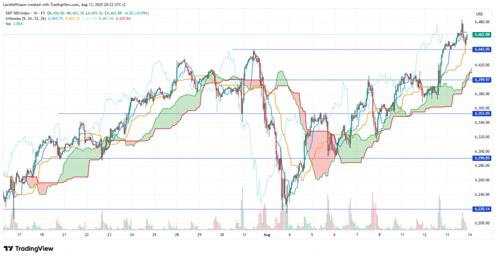 Der S&P 500 erreichte ein neues Allzeithoch und notierte kurz nach dem heutigen Handelsstart bei 6.484 Punkten. Danach folgt jedoch ein bearisher Umkehrstab, der für anstehende Gewinnmitnahmen sprechen könnte. Immer wieder betonen Anleger, dass neben den Inflationsdaten das Notenbank-Symposium in Jackson Hole entscheidende Hinweise auf die zukünftige Geldpolitik haben könnte. Unter der 6.442 könnten die Marken von 6.353 und 6.290 Punkten interessante Ziele für die Bären sein.