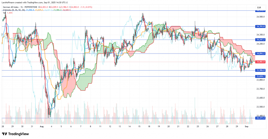 Der DAX verteidigte die Unterstützung um 23.900, ohne eine nachhaltige Gegenbewegung zu starten. Immerhin kreuzte der Tenkan den Kijun. Dies bewegt mich zu einer neutralen Haltung, obwohl der Kurs im Stundenchart noch unter der Wolke verweilt. Etwas stabiler wird das Umfeld erst über 24.100.