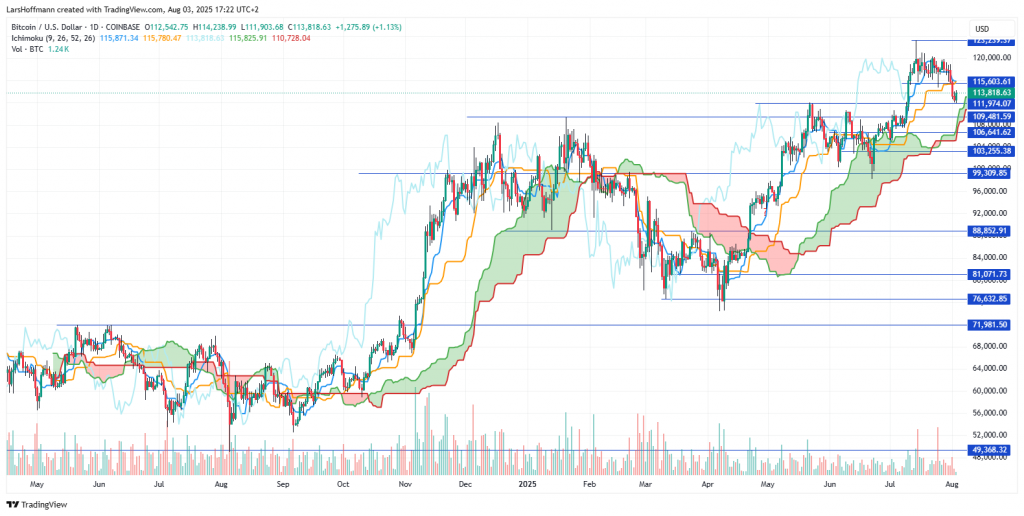 Bitcoins haben sich an der Börse als Risikoanlage etabliert und so geht es aktuell für die Kryptowährungen nach unten. Beim Bruch der Unterstützung bei 111.974 Dollar würde der Bitcoin unter sein altes Allzeithoch und kurz darauf im Dailychart unter die Wolke fallen. Dies könnte ein Wiedersehen mit der 99.300 begünstigen. Am Sonntag vollzog die Kryptowährung eine Gegenbewegung, die möglicherweise einen bullishen Umkehrstab produziert. Eine Prognose ist daher schwer.