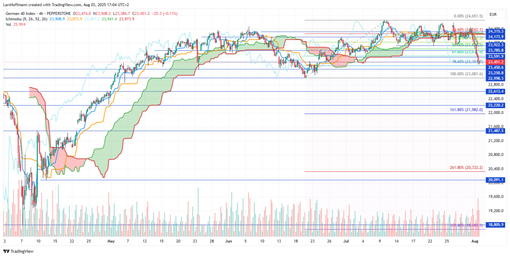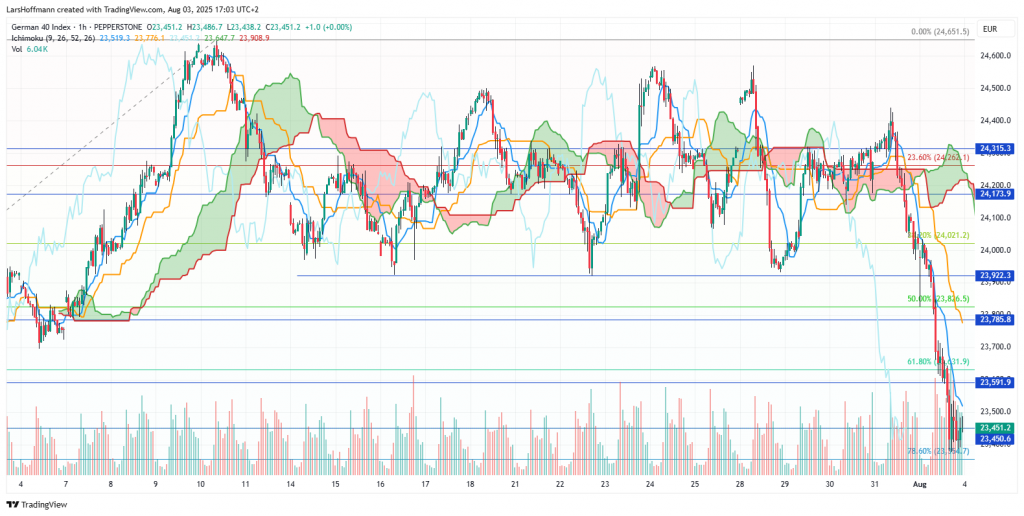 Ferner bleibt offen, wie hoch die Einfuhrgebühren für Pharmaka sein werden. Händler fragen sich zudem, wie die USA der EU innerhalb von drei Jahren Rohstoffe zur Energiegewinnung im Wert von 750 Milliarden US-Dollar zur Verfügung stellen wollen. Nach Ansicht von Analysten verfügen die Vereinigten Staaten über keine derartigen Kapazitäten. Der Aufbau der Förderanlagen dürfte mehr als ein Jahrzehnt dauern. Beobachter vermuten, dass Trump zu Hause eine große Zahl präsentieren wollte. Dies hofft offenbar die EU-Kommission auch von der erzwungenen Zusage, 600 Milliarden Euro in den USA zu investieren. Was passiert jedoch, wenn Trump es ernst meinte und sich keine privaten Investoren finden? Die Börse tut das in unsicheren Zeiten Übliche. Der DAX durchbrach die wichtige Unterstützung bei 23.590 Punkten.