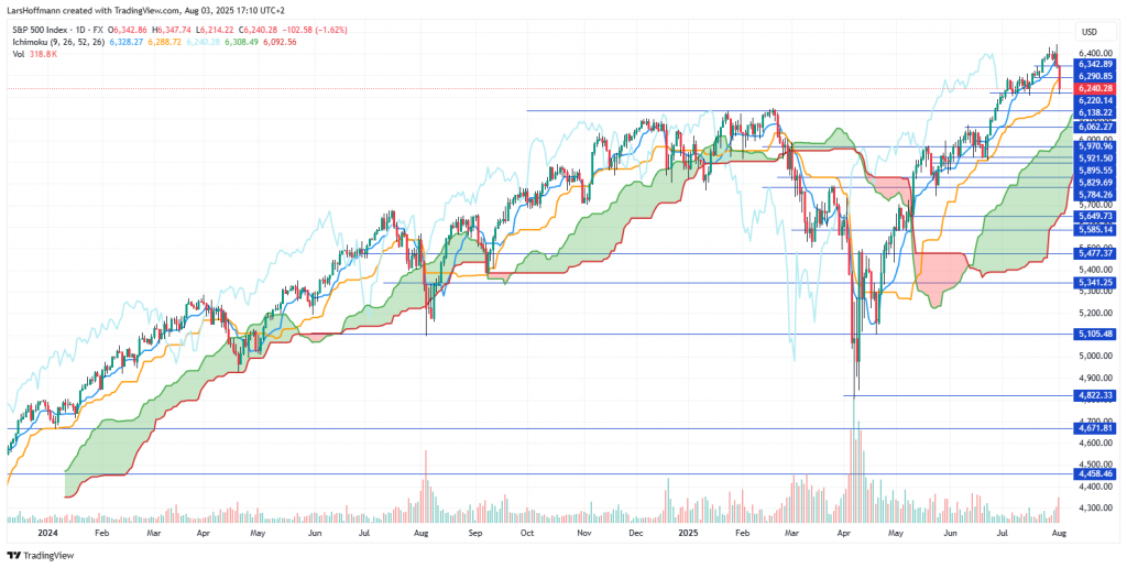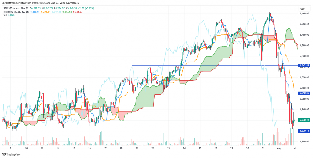 Die Börsen in New York kamen erst am Freitag unter Druck. Dazu trug nicht nur der schwache Arbeitsmarkt bei. Den Händlern fiel ein, dass die Auswirkungen der Zölle Trumps keinen Bogen um die USA machen werden. Viele Zulieferteile und Rohstoffe werden deutlich teurer, was die Konkurrenzfähigkeit der US-Unternehmen verschlechtern dürfte. Der S&P 500 fiel auf den wichtigen Support bei 6.220 Punkten.