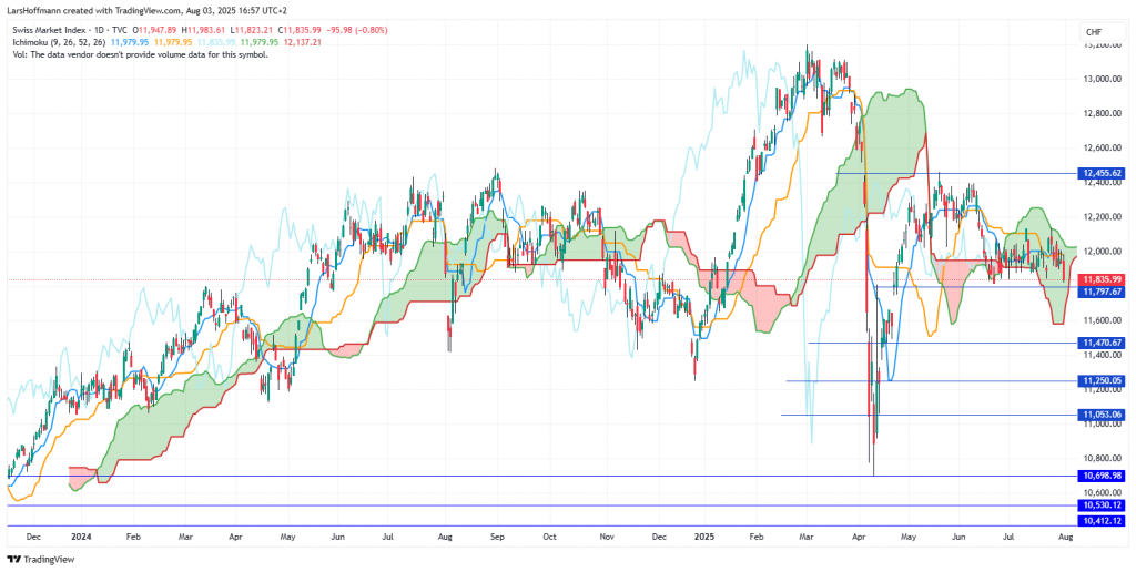 Da die Schweiz am Freitag ihren Nationalfeiertag beging, wird die Börse in Zürich erst am Montag auf die schlechten Nachrichten reagieren. Wahrscheinlich ist der Bruch der 11.800. Ein erstes Ziel ist die 11.470. Läuft es sehr schlecht, könnte sich der SMI Richtung Jahrestief bei 10.700 Punkten bewegen.