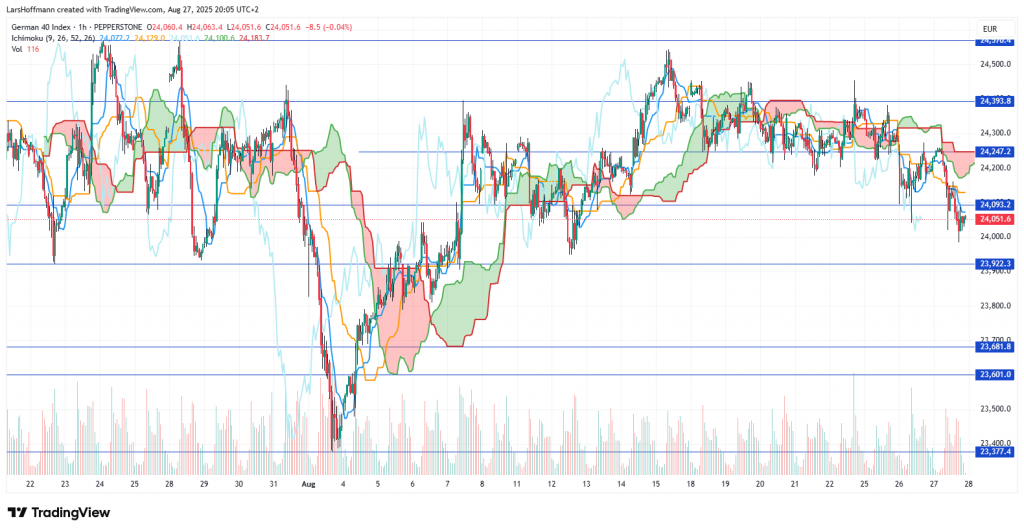 Der DAX gab seit Anfang der Woche über 300 Punkte ab. Bisher bleibt der Ichimoku im Stundenchart bärisch. Unterstützungen sind bei 23.920/680/600 zu erwarten. Über 24.250 dürften die Börsen wieder Zuversicht signalisieren.