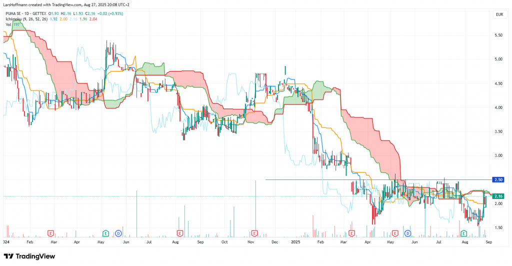 Deutlich zulegen konnte Puma. Die Großaktionärsfamilie Pinault plant, ihren Anteil (29 %) an Puma zu veräußern. Es gibt Gespräche mit einigen Interessenten, das Ergebnis ist jedoch offen. Charttechnisch interessant wird der Kurs jedoch erst über 2,50 €. Dann könnte die Aktie ein Comeback versuchen. Bisher geht es zunächst darum, den Doppelboden bei 1,50 zu bestätigen.