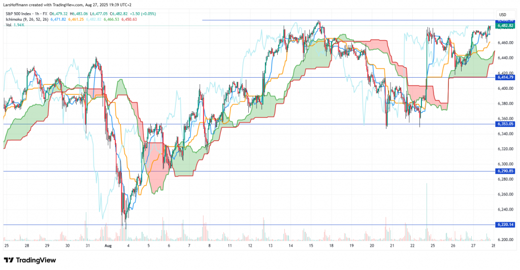 Der S&P 500 zeigt sich von dem Theater ebenfalls unbeeindruckt und handelt nahe seines Allzeithochs. Das Chartbild bleibt ausgesprochen freundlich, was der allgemeinen Wirtschaftsstimmung widerspricht. Daran haben wir uns an den Börsen jedoch schon gewöhnt. Für die Marktteilnehmer sind die Renditeaussichten für Investitionen in Aktien weiterhin lukrativ. Mit der erwarteten Zinssenkung durch die Fed, werden die Börsen voraussichtlich mit weiterem Geld geflutet, das Borgen von Liquidität wird günstiger. Auf der Unterseite sind bei 6.415/353 Unterstützungen erkennbar.