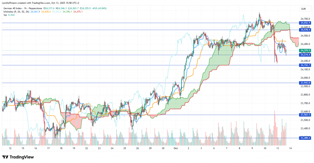 Die Bundesregierung hofft jedoch, dass die Krise bald vorüber ist, und verweist auf ihre Anstrengungen. Sie rechnet deshalb aller Kritik zum Trotz schon im kommenden Jahr mit einem signifikanten Wirtschaftswachstum und der Markt hofft mit. Der DAX markierte deshalb in der vergangenen Woche ein neues Allzeithoch. Nach dem von Donald Trump ausgelösten Absturz am Freitag sieht das Chartbild im Stundenchart jedoch bearish aus. Ein Buch des Supports bei 24.150 Punkten könnte den Index möglicherweise bei 23.560 führen.