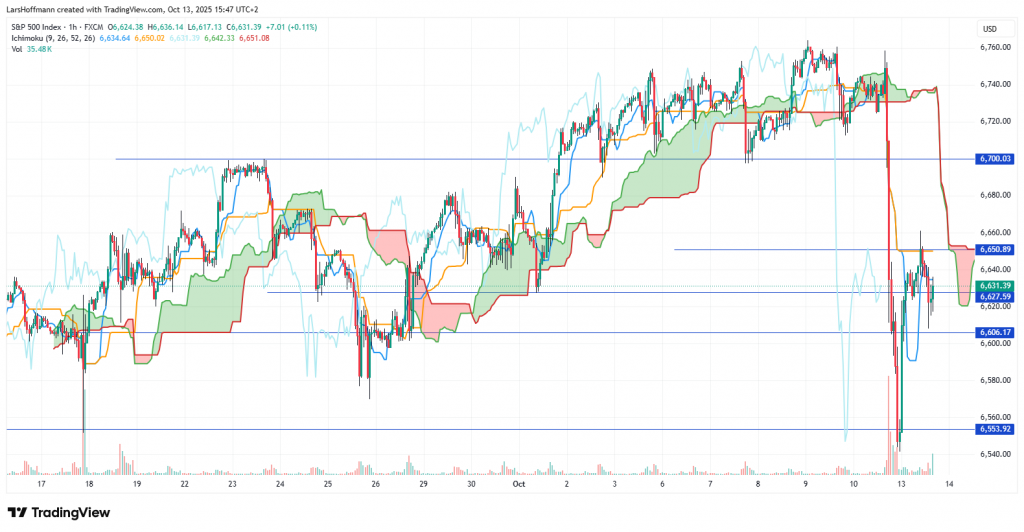 Der S&P 500 kämpft im kurzfristigeren Stundenchart um eine Stabilisierung. Entscheidend für die Bullen könnte sein, ob die Marke 6.550 hält. Über 6.650 könnte kurzfristig die Stabilisierung nachhaltig werden.