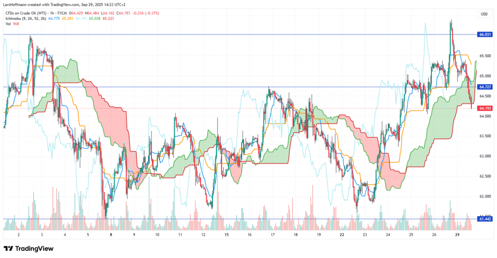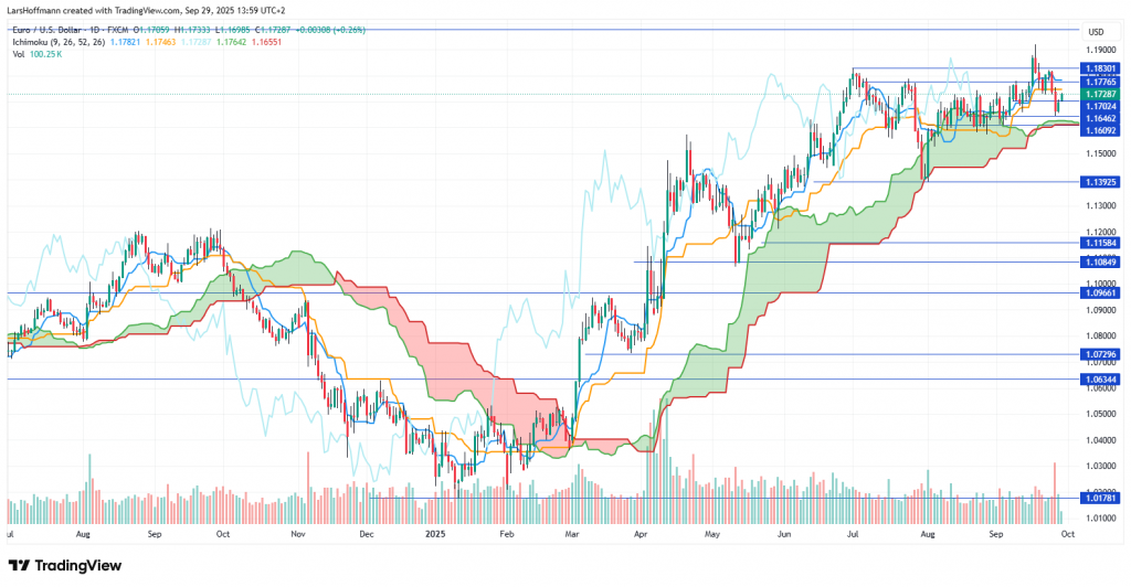 Der Ichimoku des Dailycharts präsentiert sich aktuell neutral. Der Kurs befindet sich unter Tenkan (blau) und Kijun (orange). Trotz einer relativ großen Wahrscheinlichkeit für weitere Zinssenkungen in den USA kann der Euro aktuell nicht profitieren. Ein gewissen Gefahr geht für die Bullen von der dünnen Wolke bei 1,1610 aus, deren Bruch eine Korrektur auf 1,1390/155 bewirken könnte.
