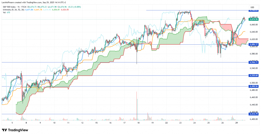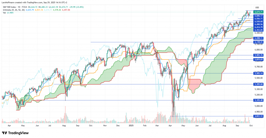 Übergeordnet bleibt das Chartbild sehr bullish. Bearish wird es erst unter 6.200 Punkten. Die Wolke signalisiert eine starke Unterstützung im Bereich 6.400/200.